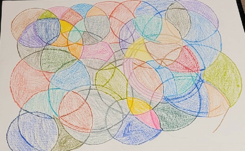Um ano depois, após emagrecer 88,4 quilos, John fez um desenho com círculos coloridos, com composição estética ousada com a utilização - pela primeira vez na vida - do compasso; surpreendeu-se por improvisar, tanto no uso de cores como das formas. Fez uma linha inacabada que ele associou a uma abertura ao devir, sem a necessidade de preencher todos os espaços. Este segundo desenho pode ser observado na Figura 2.