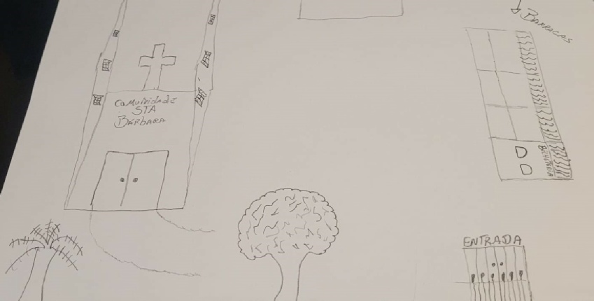 John participou de um ateliê de desenho de livre expressão. Em seu primeiro desenho, contou que a cor – ausente - para ele não importava e desenhou uma igreja. Neste desenho, há pouca perspectiva nas formas, incongruência entre as dimensões de uma imagem esquemática vista de cima com elementos vistos de frente. Mostrou percepção distorcida sem se dar conta das descontinuidades. O afeto aparece no relato verbal em relação às pessoas queridas e à igreja. Seu primeiro desenho pode ser visto na figura 1.